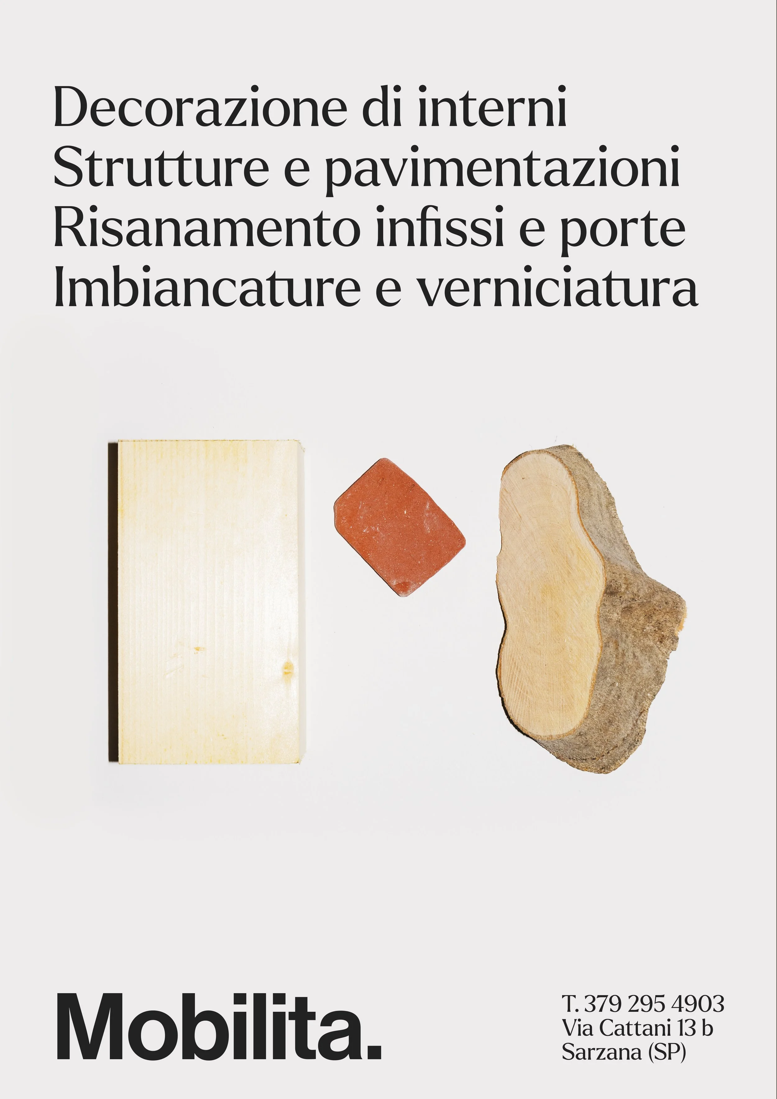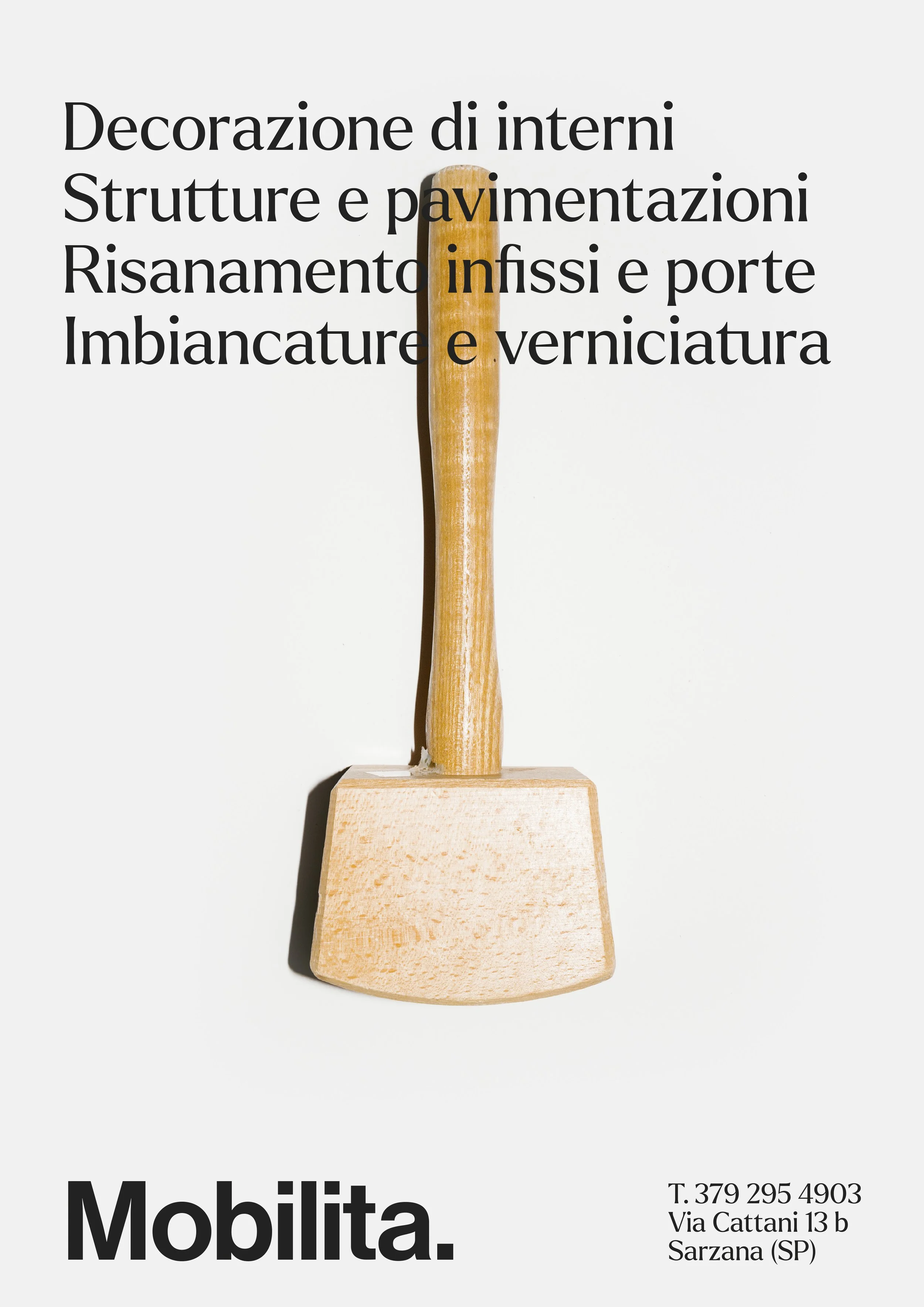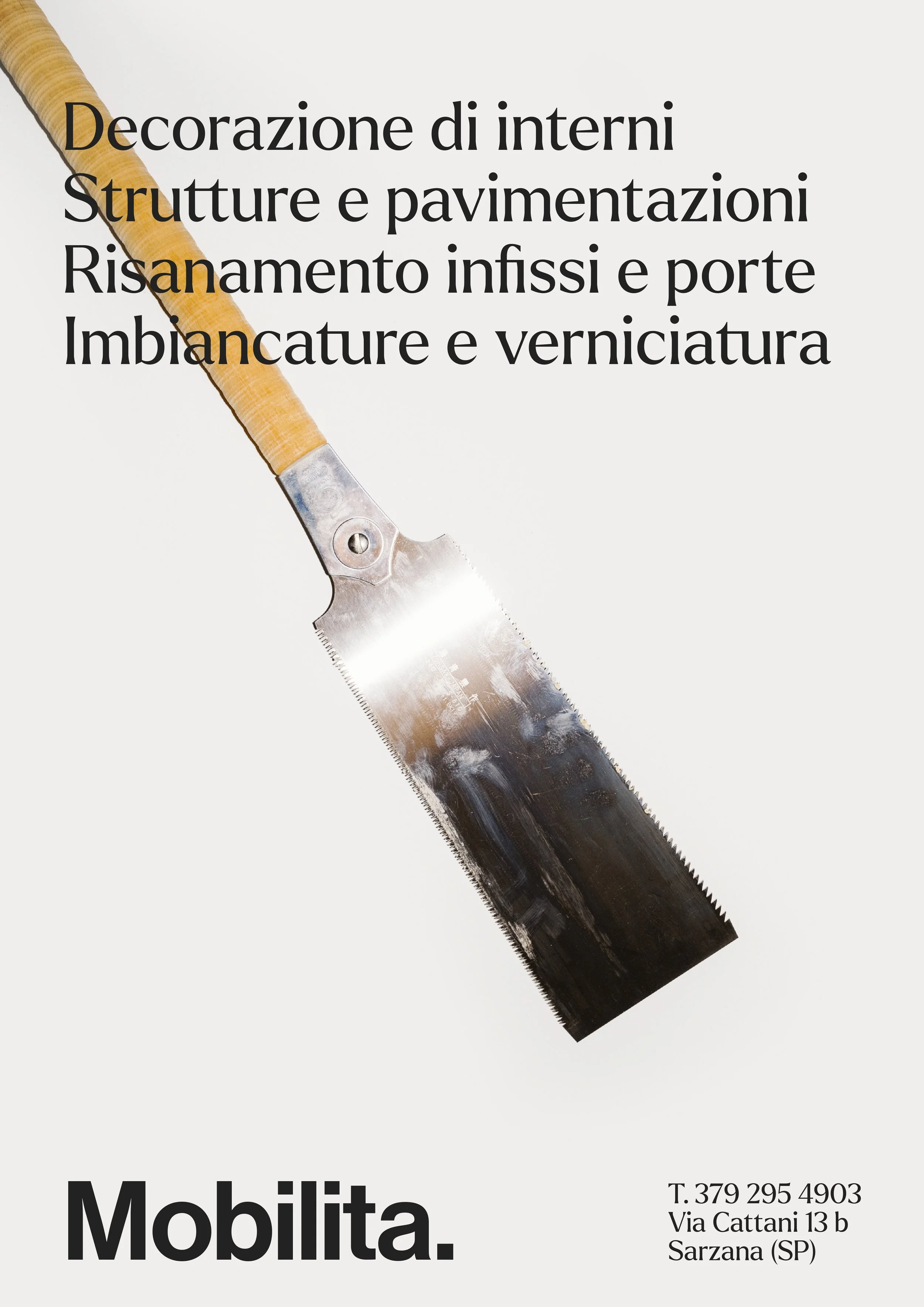 MOBILITA. is a company that fixes things, improves things, restyles spaces, paints walls, doors and windows. All artisanal, done by hand, with the greatest care and creativity. A mix of modern typography and contemporary photography was used to translate this manual, skilled approach and the quality of the work into a visual identity that also sets the company instantly apart from the competition.